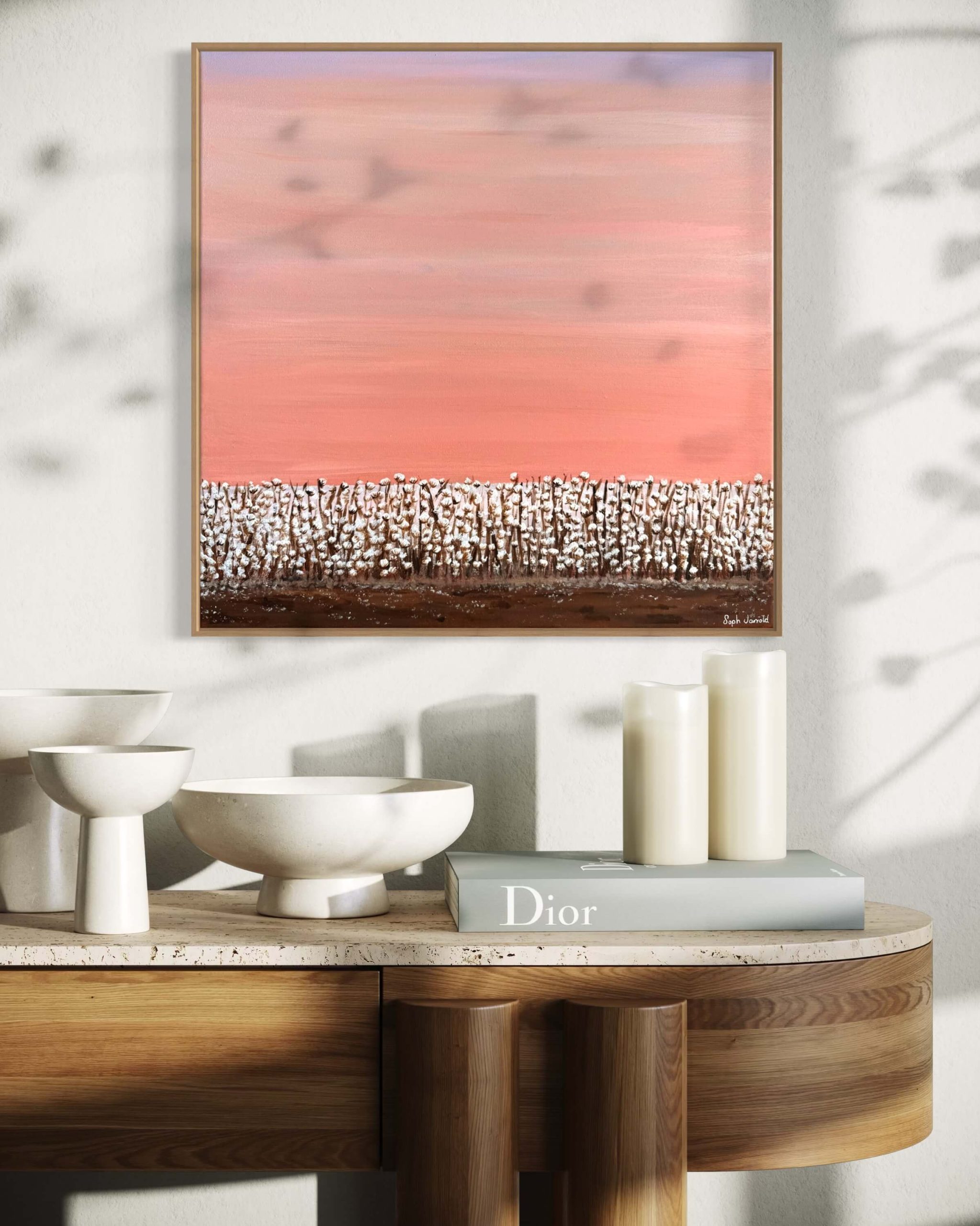 Soft pastel tones blend with earthy textures in this calming depiction of nature’s bounty.