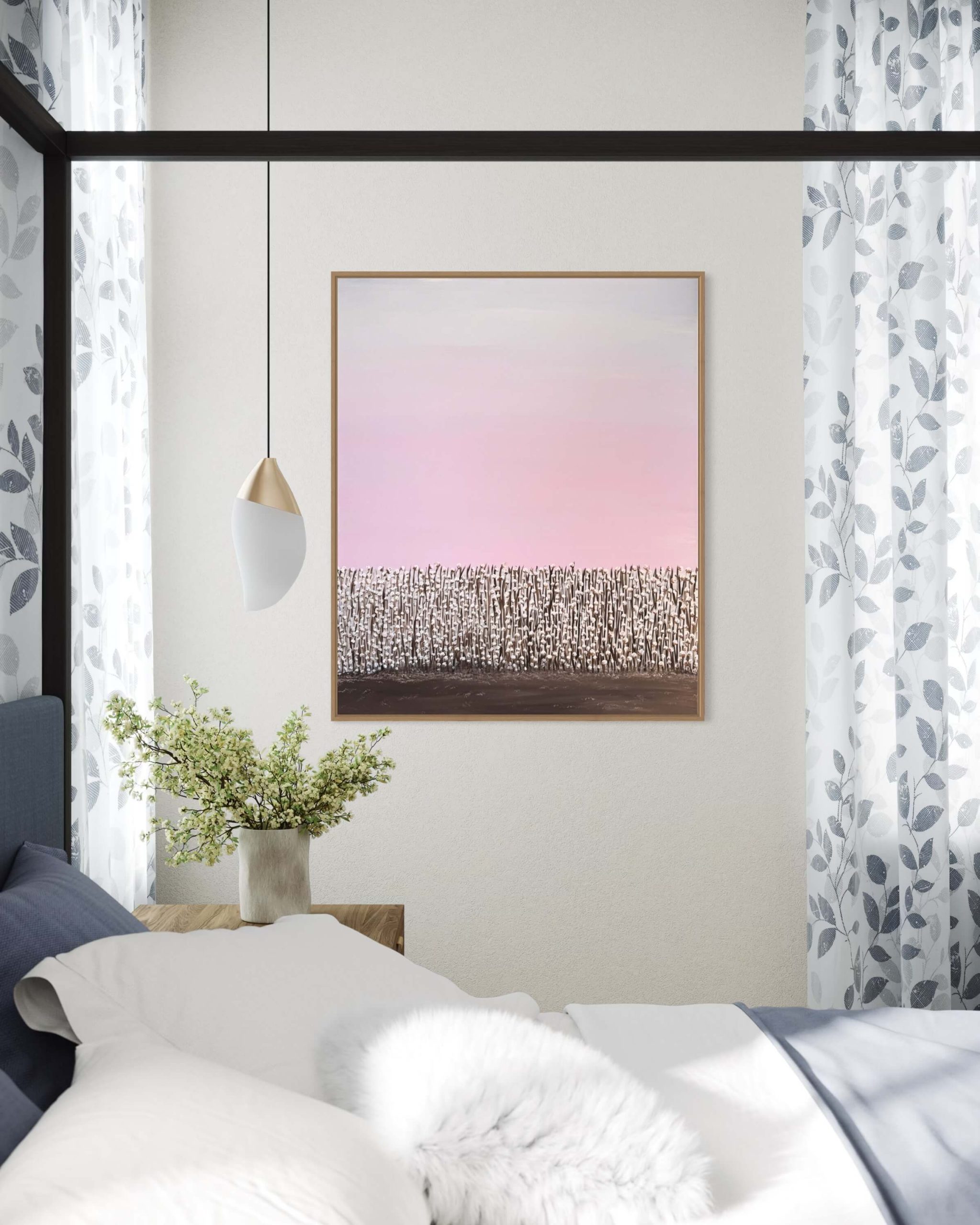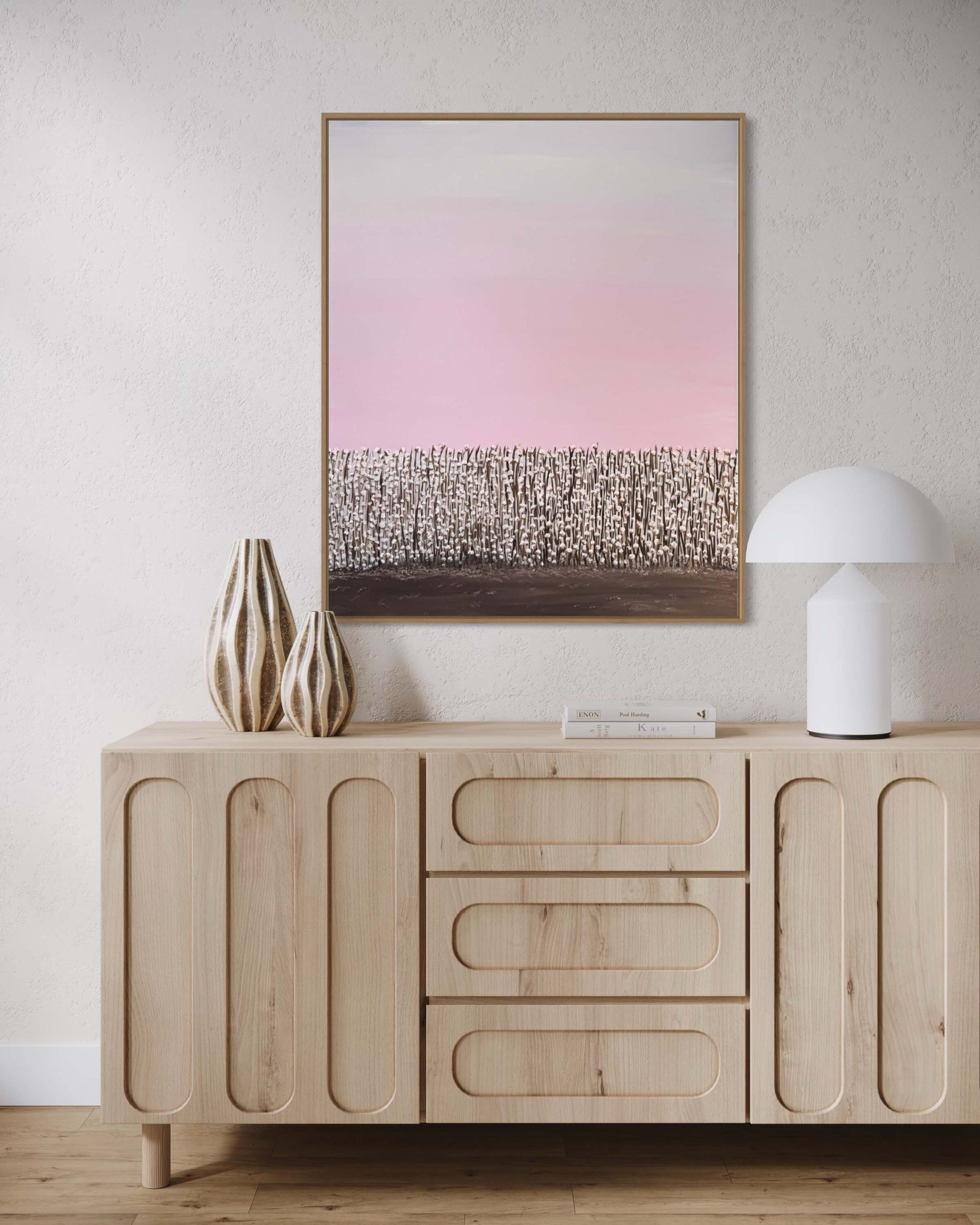 75 x 90 cm Framed American Ash Dynamic acrylic on canvas A serene landscape blending soft pink hues with textured earth tones, inviting calm.